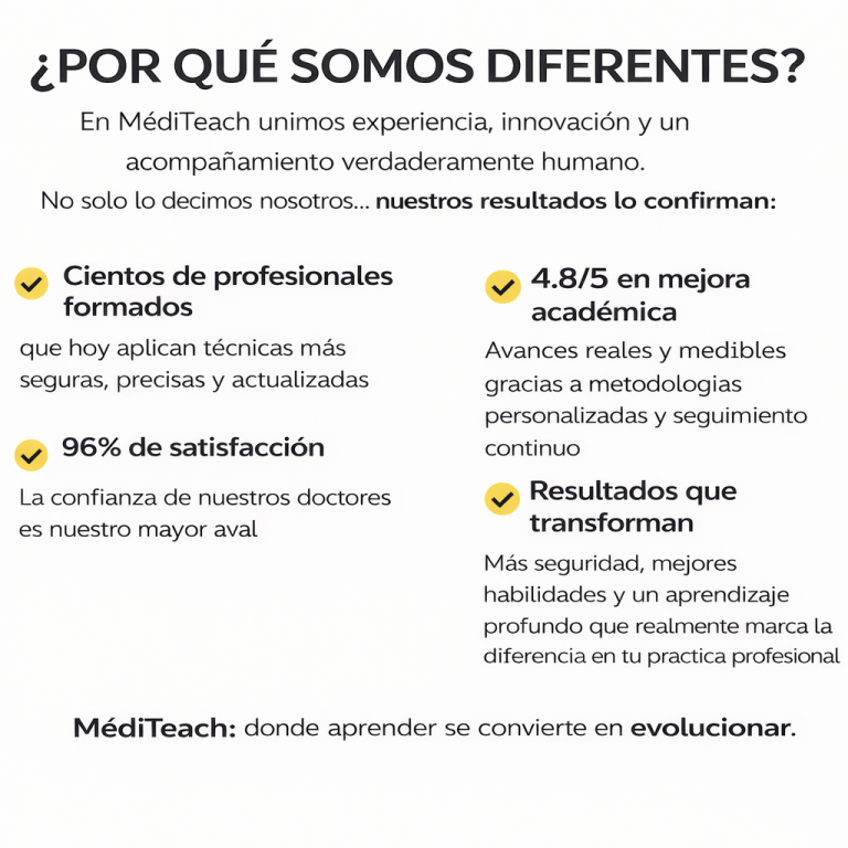 Recibirás retroalimentación personalizada de médicos con amplia experiencia clínica, lo que acelera tu curva de aprendizaje lo cual incrementa la seguridad clínica reduciendo riesgos en procedimientos y manejando complicaciones con protocolos actualizados para reforzar tu marca personal, mostrar tu crecimiento profesional y nuevas tendencias.